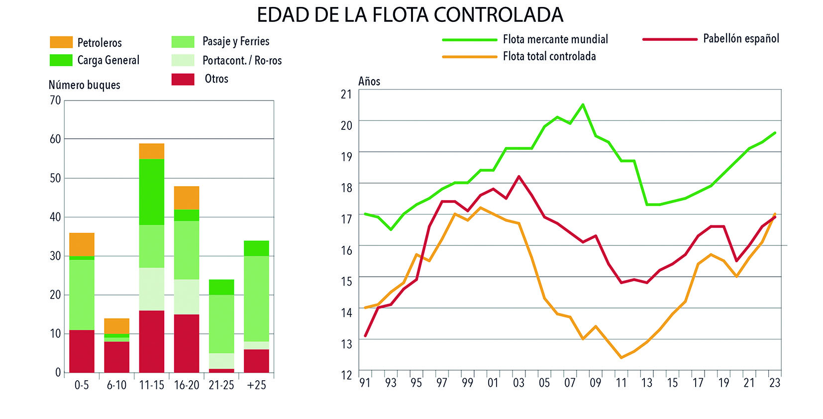 La edad media de la flota controlada aumentó durante 2022 desde los 16,6 hasta los 16,9 años. Los segmentos más jóvenes, por tipos de buques, son los gaseros (10,4 años de media), seguidos de los graneleros (12,6), quimiqueros (12,1) y portacontenedores (14,9). El segmento de mayor edad corresponde a los buques de pasaje (19,2), buques ro-ro (21,4) y frigoríficos (35,6). La edad media de la flota inscrita en el REC aumentó 0,9 años hasta alcanzar 17, superando ligeramente a la de la flota controlada por primera vez desde hace más de 25 años.