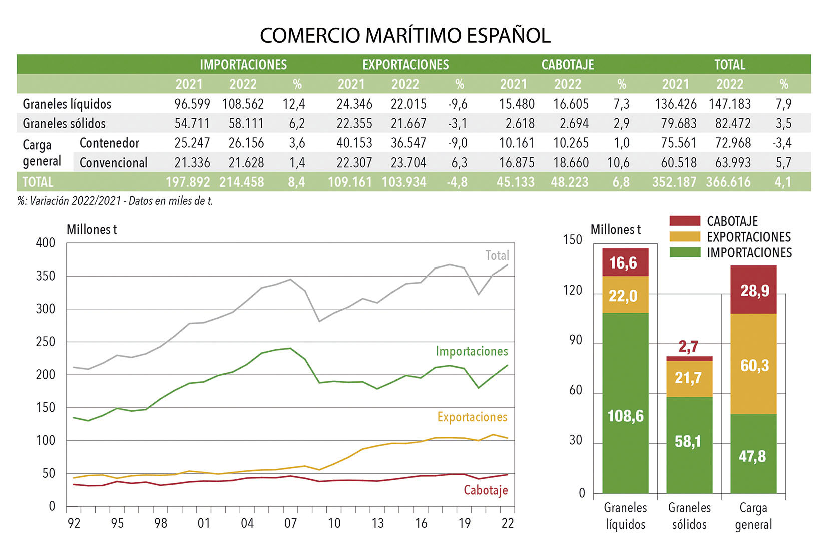 A 1 de enero de 2023, la flota mercante controlada por navieros españoles comprendía 215 buques y 5,3 millones de GT (+5,3%). A lo largo de 2022 se incorporaron a la flota de navieras españolas tres buques de nueva construcción: dos metaneros y un quimiquero. En conjunto suman 253.707 GT y suponen una inversión de unos 362 millones de euros. Todos se inscribieron en registros del Espacio Económico Europeo (EEE), pero ninguno lo hizo en el Registro Especial de Canarias (REC), lo que demuestra, según el informe de ANAVE, que el gran esfuerzo de la DGMM por actualizar la normativa y práctica del REC no resulta suficiente para relanzar su competitividad. “No quiero que se me entienda mal”, aseguró Vicente Boluda, presidente de ANAVE, en su discurso durante la asamblea general, “probablemente la base del problema es la falta de visibilidad del sector del transporte marítimo en la agenda política nacional, al más alto nivel”. Propone una reforma estructural completa del REC, “que involucre a todos los ministerios” y “adaptar el marco laboral, la ley de Prevención de Riesgos Laborales pensada para las industrias en tierra y la burocracia e incertidumbre asociada a las inspecciones del Convenio del Trabajo Marítimo”.