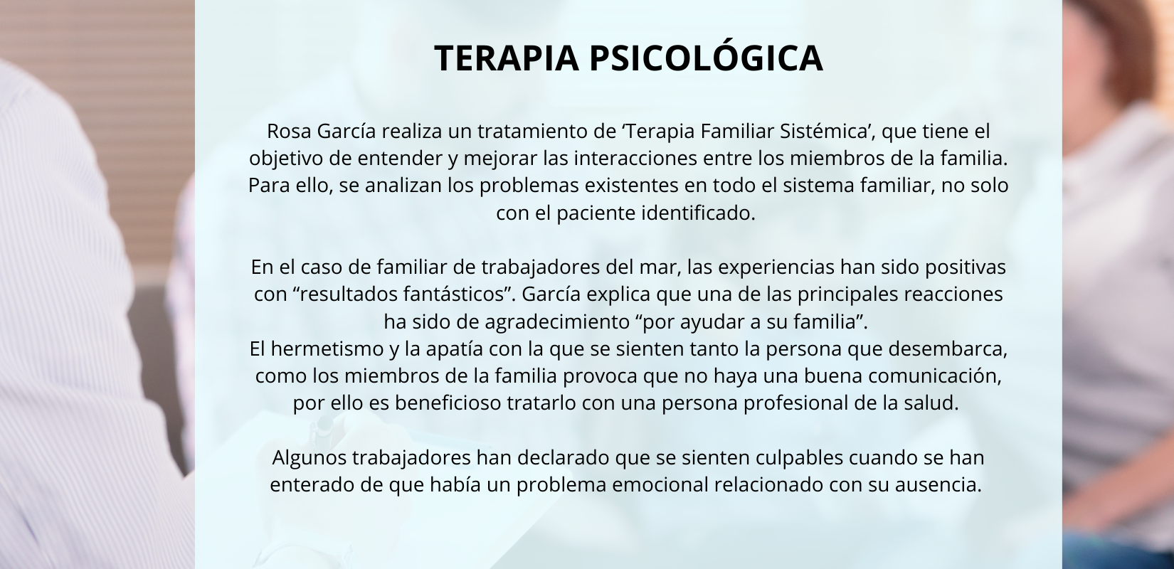 Los marinos han tenido una actitud positiva una vez que han sabido que su familia necesitaba venir a mis sesiones. Cuando les he explicado en qué consistía la terapia y que necesitaba que ellos vinieran a la consulta, siempre han tenido una muy buena predisposición. Incluso se mostraban agradecidos por ayudar a su familia porque ellos no habían notado esa necesidad. En ocasiones, se pueden sentir culpables cuando llegan y la pareja les comenta la situación en la que se encuentra el hogar.