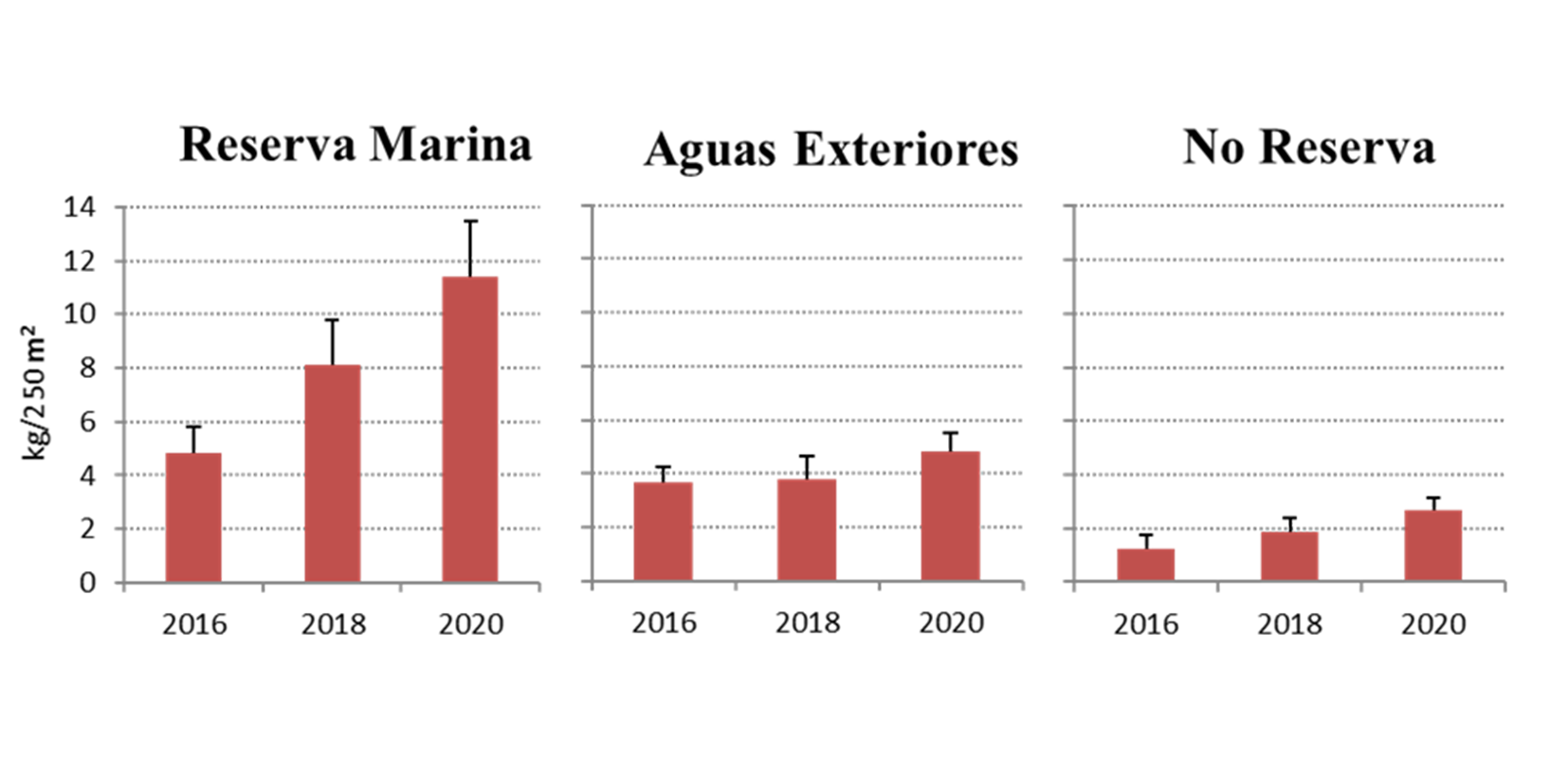 La riqueza de especies ha aumentado en un 40% en las aguas superficiales y en un 81% en las aguas profundas de la reserva, alcanzando valores de hasta ocho especies/250 m2 en 2020. La biomasa total de especies vulnerables se ha incrementado en un 138% en las aguas superficiales (cuadro 1). Los valores medios actuales de la reserva se sitúan en 11,4 kg/250 m2 frente a los 2,7 kg/250 m2 de las zonas no protegidas o los 4,8 kg/250 m2 de las estaciones de aguas exteriores. En las aguas profundas la biomasa media ha aumentado un 340%, situándose en 25,3 kg/250 m2 en el último censo (Cuadro 2).
