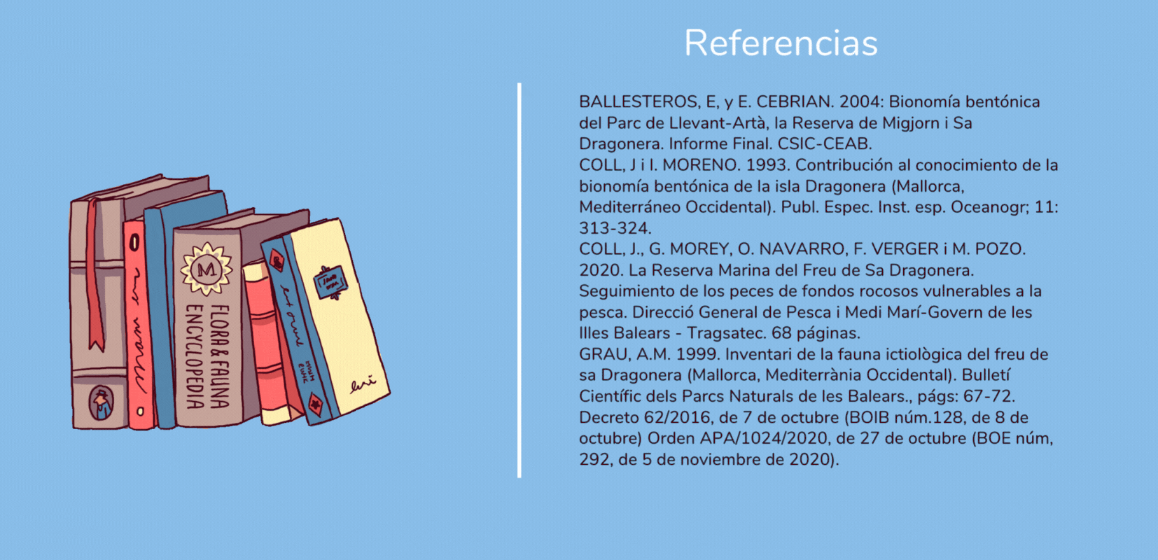 La dicotomía entre los fondos aplacerados, cubiertos por la planta Posidonia Oceanica junto a arenas limpias y claras en las aguas interiores del estrecho que la separa de Mallorca, frente a los acantilados submarinos verticales, de un azul cobalto aparentemente insondable en su sector oeste, estructuraba las primeras descripciones sobre las comunidades marinas de la Dragonera (Coll i Moreno, 1993; Ballesteros y Cebrián, 2004).