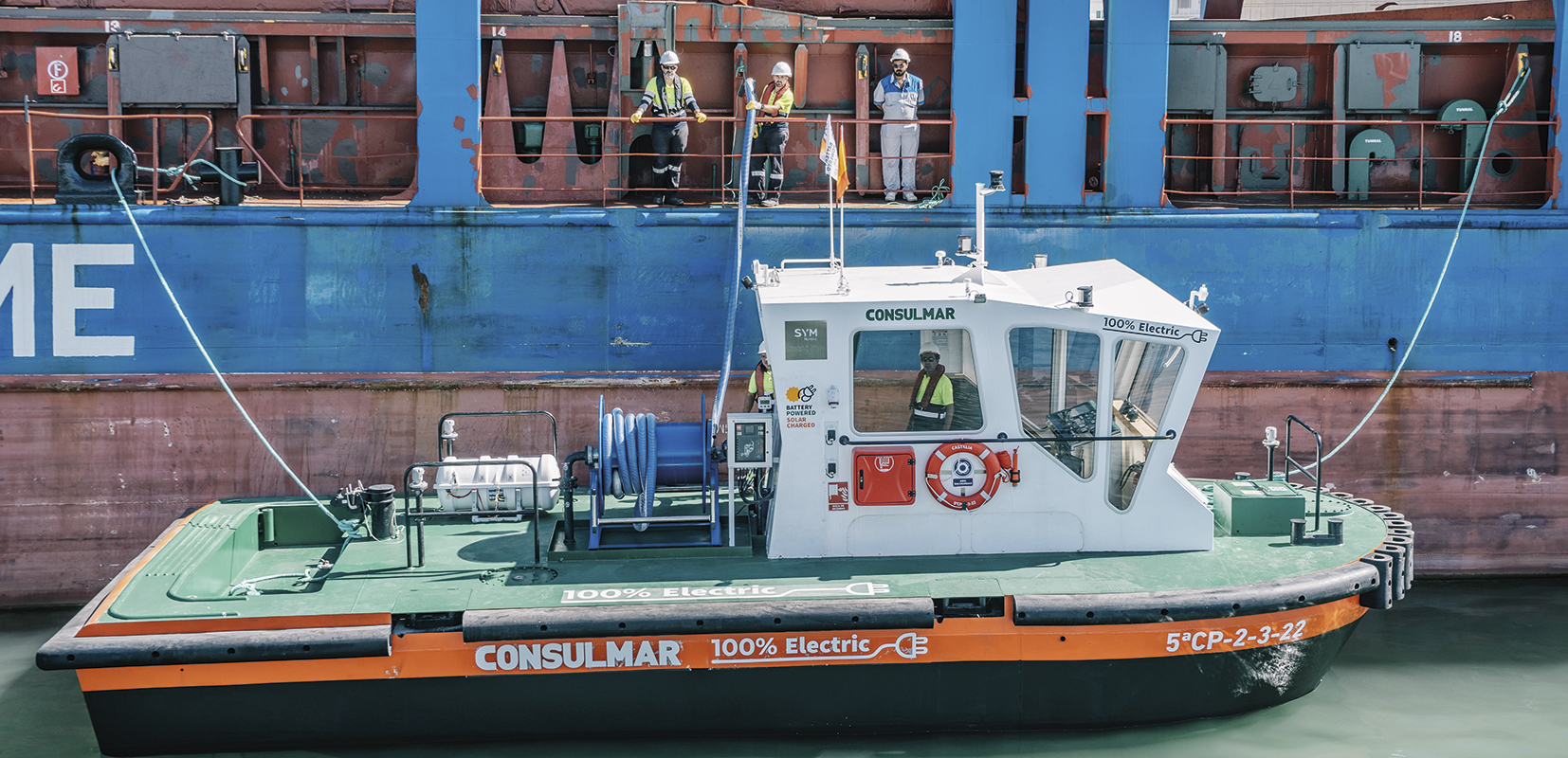 De Consulmar y Sym Naval es la embarcación bautizada Castalia, de 12,50 metros de eslora y 5 metros de manga, que opera desde este mes de octubre en el puerto de Castellón. Se proyectó como un barco multipropósito 100% eléctrico; con dos motores de 240KW; 500KWH de baterías de litio; una autonomía operativa de diez horas; espacio para 12 pasajeros; capacidad de recogida de residuos líquidos de 30 m3  y un tiro de remolque de tres toneladas. Adicionalmente integra un sistema de digitalización que permite su monitorización en remoto. Es capaz de llevar a cabo operaciones de amarre y desamarre de buques; recogida de residuos líquidos y sólidos MARPOL; transporte de personal (con capacidad de hasta 12 pasajeros) y de material y provisiones, además de realizar actividades auxiliares de apoyo en puerto. Según Francisco Lage, presidente de Sym Naval, el coste inicial representó un 20-30% más que el de una embarcación convencional, pero confía en que esta diferencia se amortice en poco tiempo por “el menor coste de mantenimiento de este tipo de embarcaciones eléctricas y su menor coste operativo”.