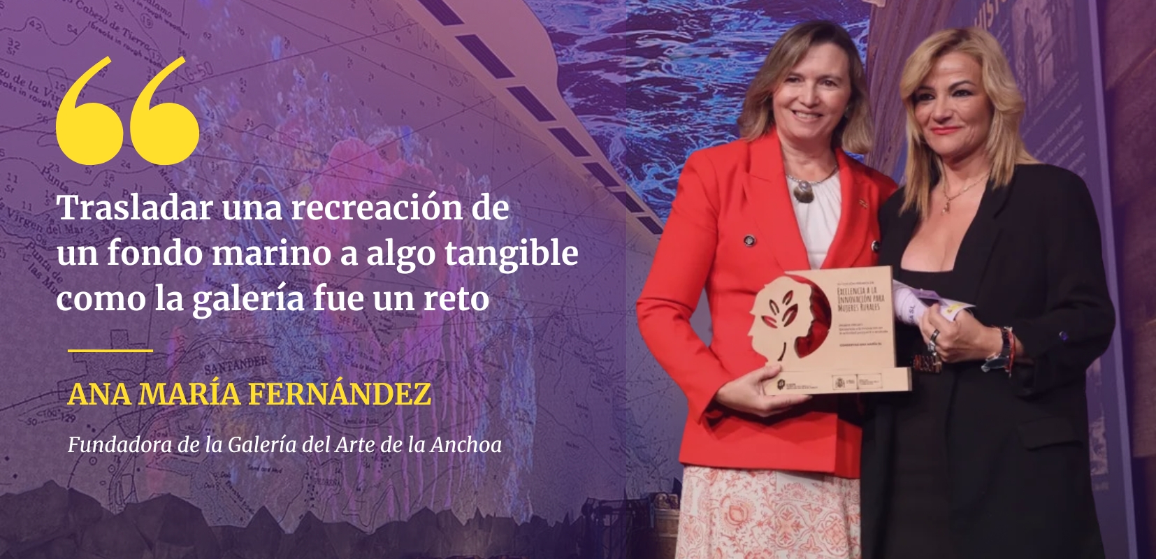 Los cinto sentidos convergen en la Galería del Arte de la Anchoa de Santoña, un espacio único que, según cuenta su creadora, “surge de la necesidad de dar voz al trabajo y dedicación de la tradición conservera”. La galería cuenta con exposiciones temporales y una muestra permanente en la que se puede disfrutar del producto estrella de Cantabria a través del gusto, vista, olfato, oído y tacto. Sobre la experiencia que viven los visitantes que recorren las instalaciones, Ana María comenta que quedan impresionados por el cuidado que se ha dedicado a la escenificación del producto y al propio museo, ubicado en un edificio considerado una obra emblemática de la arquitectura contemporánea. El proyecto combina a la perfección calidad culinaria y expresión artística. Fernández cuenta que lo que más disfrutó de la parte creativa y artística fue el reto de “trasladar una recreación del fondo marino a algo tangible”. Conoce bien el producto al que rinde homenaje, es propietaria de la empresa familiar Conservas Ana María, dedicada desde 1997 a la elaboración artesanal de la anchoa. Desde sus comienzos, su producción se centró en la fabricación de este alimento. Actualmente, han expandido su negocio a otra gama de productos como las conservas de bonito del norte para abrirse paso a nuevos mercados. En 2024 recibió el primer premio a la Excelencia a la Innovación en la actividad pesquera concedido por el Ministerio de Agricultura, Pesca y Alimentación.
