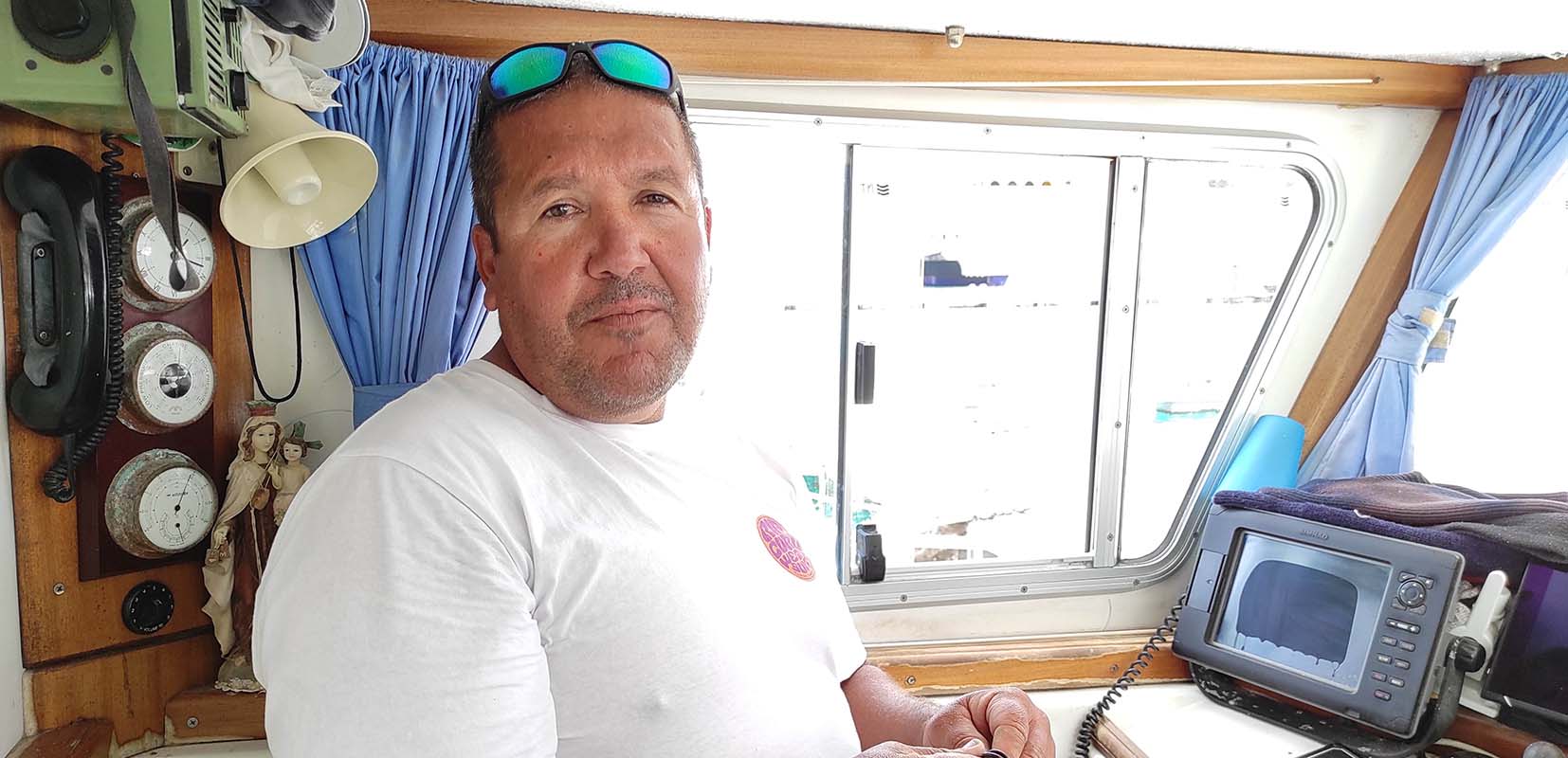 Lorenzo Brito es el patrón mayor de Gran Tarajal, también pescador de tercera generación, oficio al que dan continuidad sus dos hijos que también son pescadores y se preparan para sacar el título de patrón de litoral y en un futuro el de mecánico marinero.
