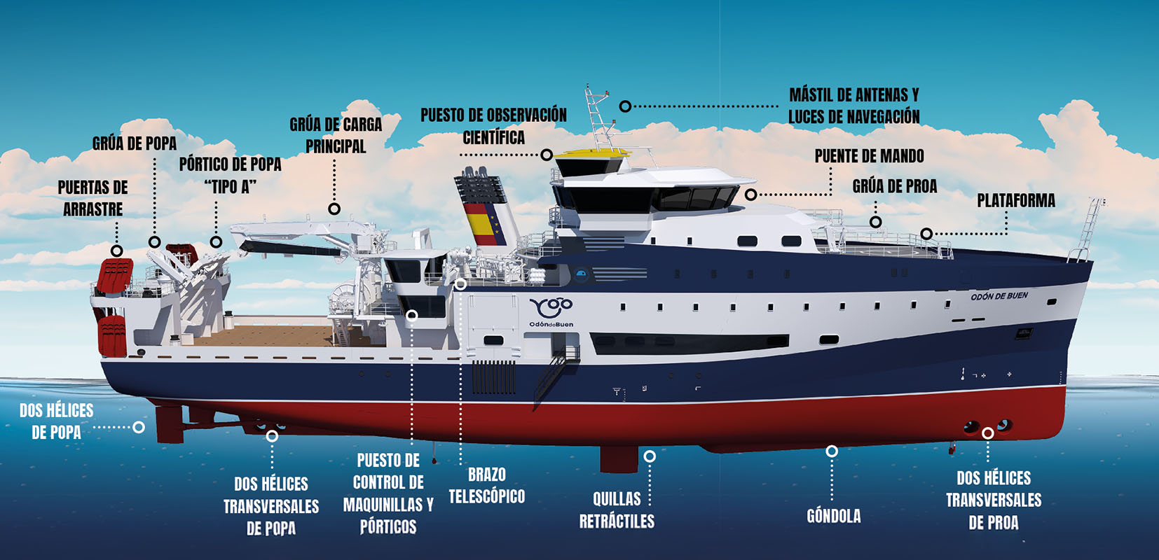 Con una eslora de 84,3 metros y una manga de 17,8 metros, el Odón de Buen es el mayor buque oceanográfico de España, diseñado para afrontar las exigentes tareas de exploración y estudio del medio marino.