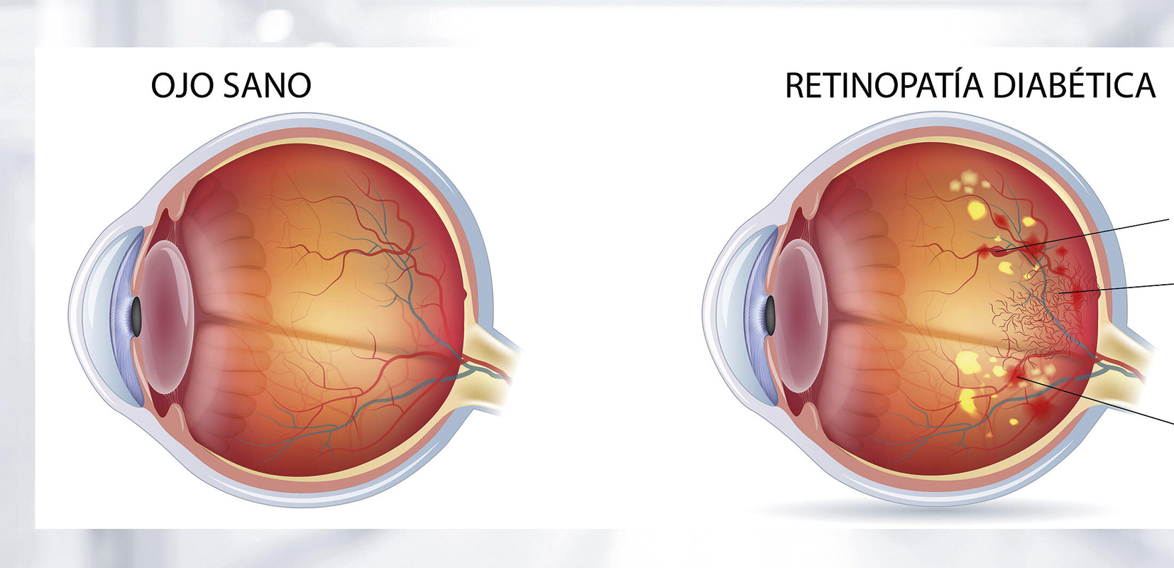 La diabetes afecta a los ojos si el nivel de glucosa en la sangre permanece alto por mucho tiempo, puede dañar los pequeños vasos sanguíneos en la parte posterior de los ojos. Estos vasos sanguíneos pueden sangrar en la parte media del ojo, formar tejido cicatricial o hacer que la presión suba a un nivel peligroso en la parte interna del ojo.