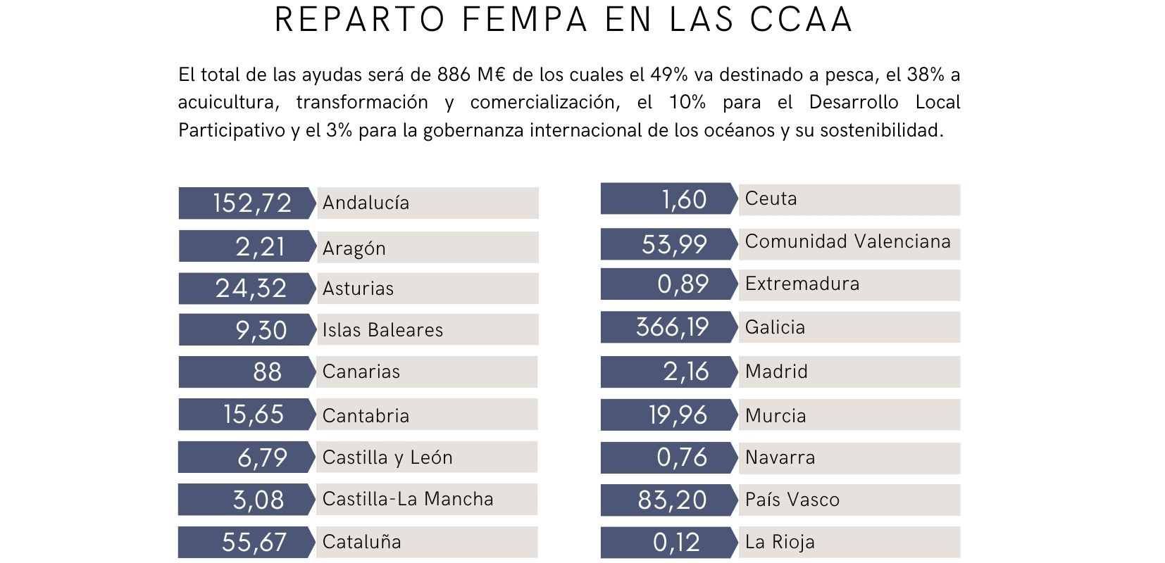 El reparto de la dotación financiera del FEMPA en España se acordó en la Conferencia Sectorial de Pesca, en julio de 2021. Galicia, con 366,19M€, es la región más beneficiada en esta ocasión. Se lleva el 32,67% de los fondos asignados a nuestro país, superando incluso los 233M€ que se reserva la Administración General del Estado. Le siguen Andalucía (152,72M€), Canarias (88M€), Euskadi (83,20M€), Cataluña (55,67M), Comunidad Valenciana (53,99M€), Asturias (24,32 M€), Murcia (19,96M€), Cantabria (15,65M) y Baleares (9,30M€). Las comunidades de interior también reciben ayudas: Castilla y León (6,79M€), Castilla-La Mancha (3,08M€), Aragón (2,21M€), Madrid (2,16M€), Ceuta (1,60M€), Extremadura (0,89M€), Navarra (0,76M€) y La Rioja (0,12M€).