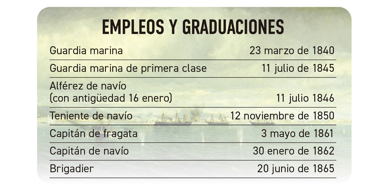 A través de estas páginas navegaremos por su trayectoria profesional: su ingreso en la Academia de Guardias Marinas y sus primeros ascensos, sus destinos, sus recompensas y condecoraciones …así como un perfil del marino considerado, por muchos de sus contemporáneos, como el más prestigioso de la Armada Española de su época y del siglo XIX. Retrato de Casto Méndez Núnez