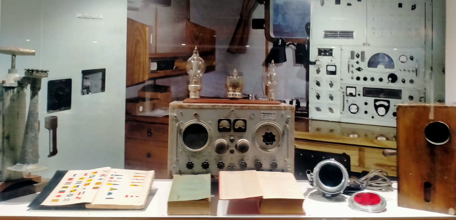 El museo está lleno de elementos que harán las delicias de los amantes de la navegación. La sala “Contra Viento y Marea. La marina mercante en Galicia 1750-2000” muestra una colección de instrumentos de comunicación y navegación o curiosidades traídas por los marineros desde el otro lado del Atlántico. Vitrina con sistemas de comunicación utilizados por los marineros.