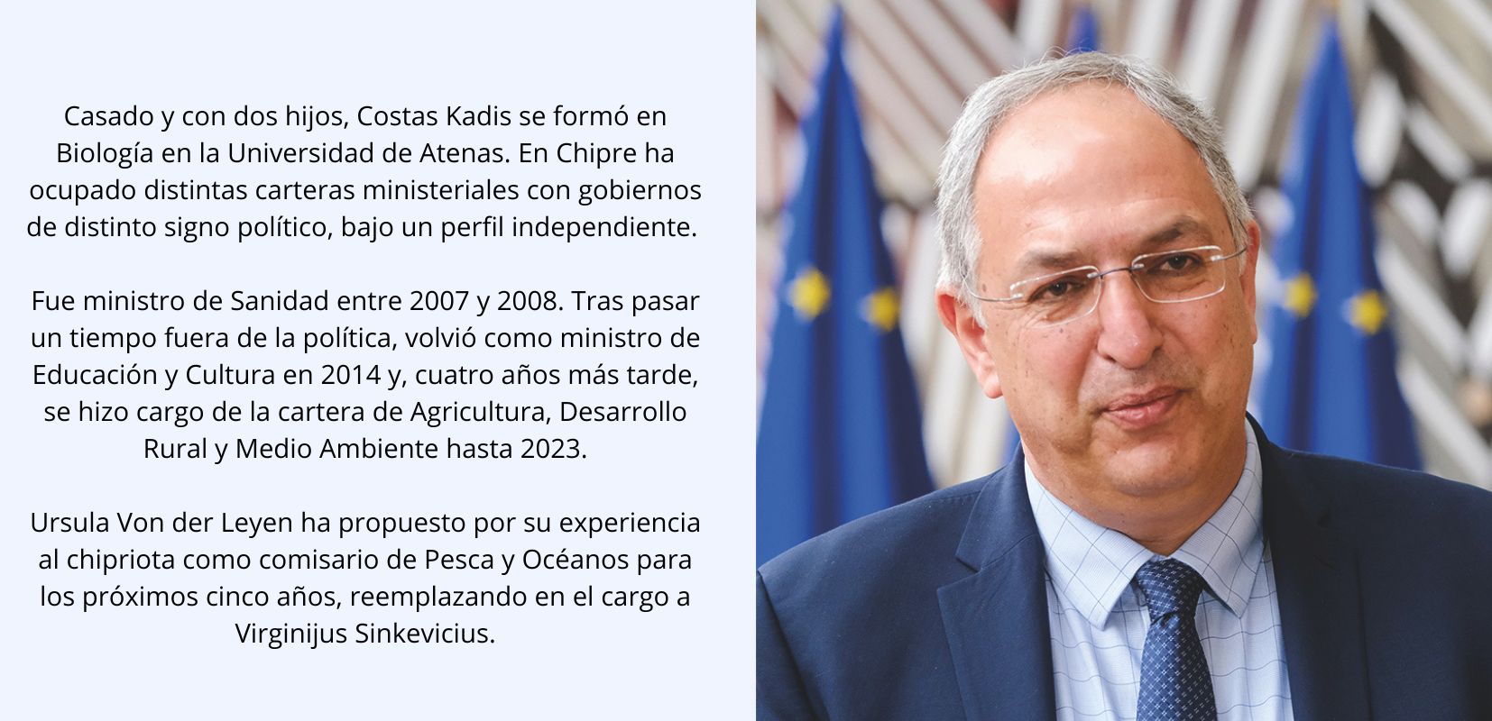 La presidenta de la Comisión Europea, Ursula Von der Leyen, cumplió su promesa proponiendo al chipriota Costas Kadis como comisario de Pesca y Océanos. La decisión de eliminar de la cartera los asuntos medioambientales es valorada como positiva, al considerarse que el mar y la actividad tienen ahora una nueva oportunidad para ser gestionados de manera sostenible, teniendo en cuenta los aspectos sociales y económicos.
