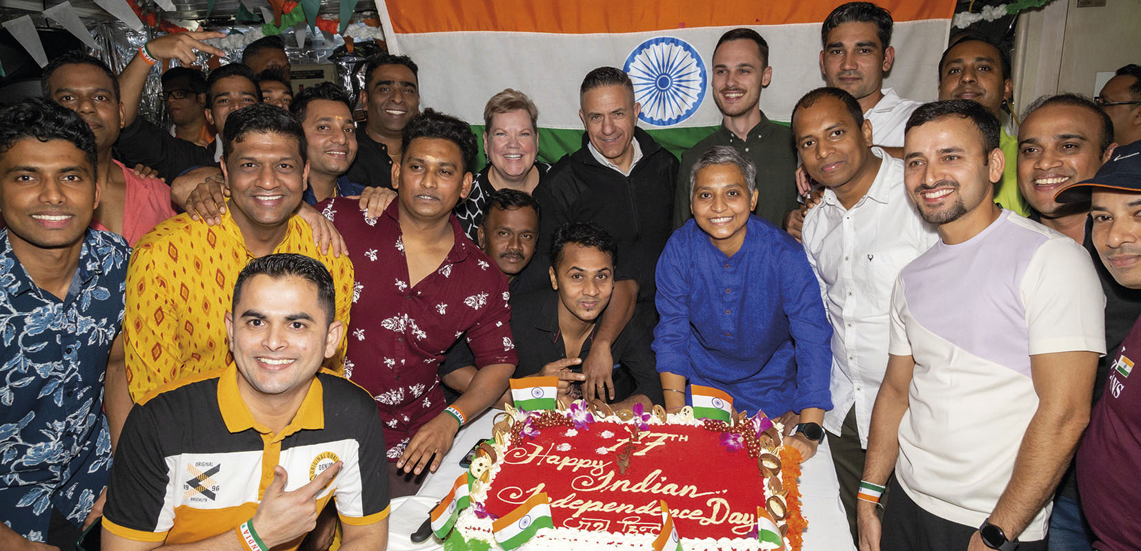Se están implementando programas de bienestar que incluyen actividades de ocio planificadas, talleres y recursos para la salud mental, reconociendo que una tripulación feliz y saludable es fundamental para el buen funcionamiento del barco. Crucero Azamara Journey celebrando el día de la independencia de la India