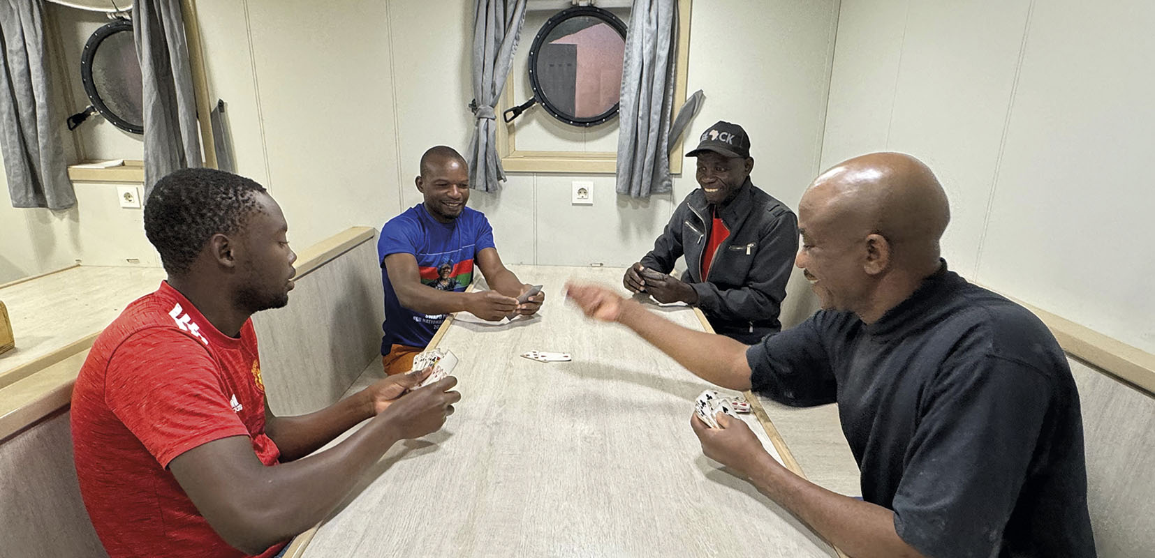 Claudio Villar, patrón del pesquero de altura Lalandii 1 de Nueva Pescanova, nos comenta: ”Nosotros faenamos a la merluza en el caladero de Namibia siendo nuestro puerto base Walvis Bay. En este caladero no realizamos navegaciones grandes, de días, como sí que se hacen en otros caladeros lejanos, aquí dependiendo de la zona a donde se vaya a pescar suelen ser navegaciones de 12 horas. La tripulación suele emplear su tiempo en hablar con su familia, jugar a juegos de mesa (cartas o dominó), leer y algunos hasta traen sus pesas para poder hacer algo de ejercicio. El espacio donde se suele jugar a los juegos de mesa es en el propio comedor de marinería del barco, donde se nota bien cuando están jugando debido a que se les escucha y se nota bastante ambiente allí reunido. La zona donde suelen ponerse a hacer ejercicio es en el castillo de proa, aquí suele haber siempre tripulantes, unos hablando de sus cosas y otros haciendo ejercicio”.