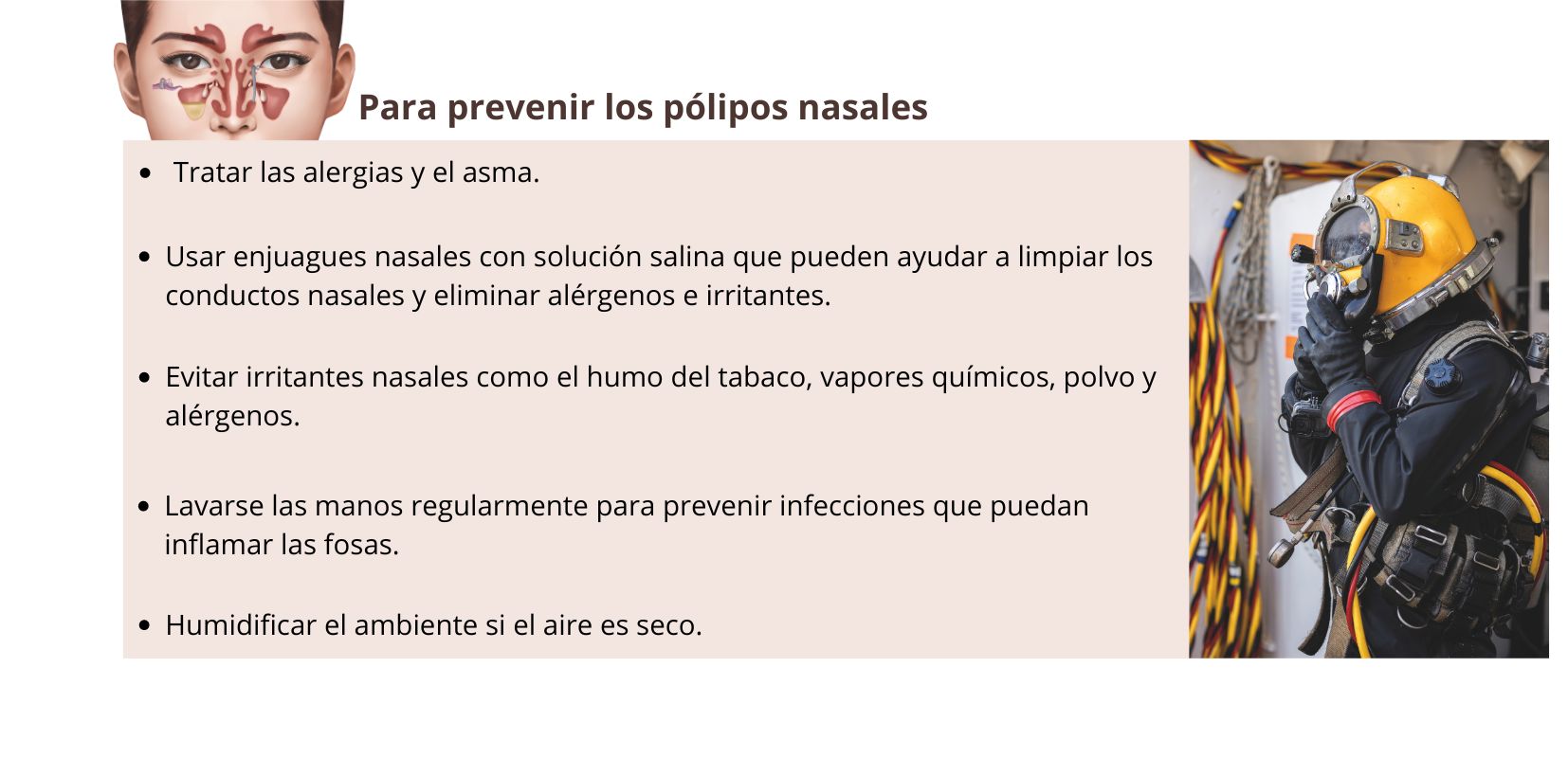 Teniendo en cuenta la repercusión de esta patología y la peligrosidad del ambiente laboral, los buceadores profesionales deben efectuar un reconocimiento médico anual que asegure que cumplen con unas condiciones de salud adecuadas para bucear de forma segura. En este caso, además de los signos referidos por el buceador, el diagnóstico inicial de los pólipos nasales se realiza mediante rinoscopia, que después se confirmará mediante endoscopia nasal y TAC, para ver cómo de extendidos están los pólipos y cómo afectan a estructuras vecinas. Cómo prevenir los pólipos nasales.TRATAMIENTO