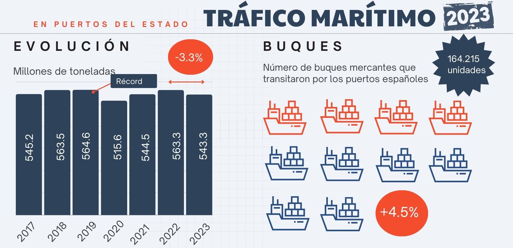 El tráfico de mercancías cierra 2023 con más de 543 millones de toneladas desplazadas en puertos de titularidad estatal. Este dato supone un descenso del 3,3% respecto a 2022. Los datos provisionales publicados por Puertos del Estado reflejan un fuerte retroceso causado por la guerra entre Ucrania y Rusia, el conflicto en Israel y los ataques en el Mar Rojo que han bloqueado el Canal de Suez.