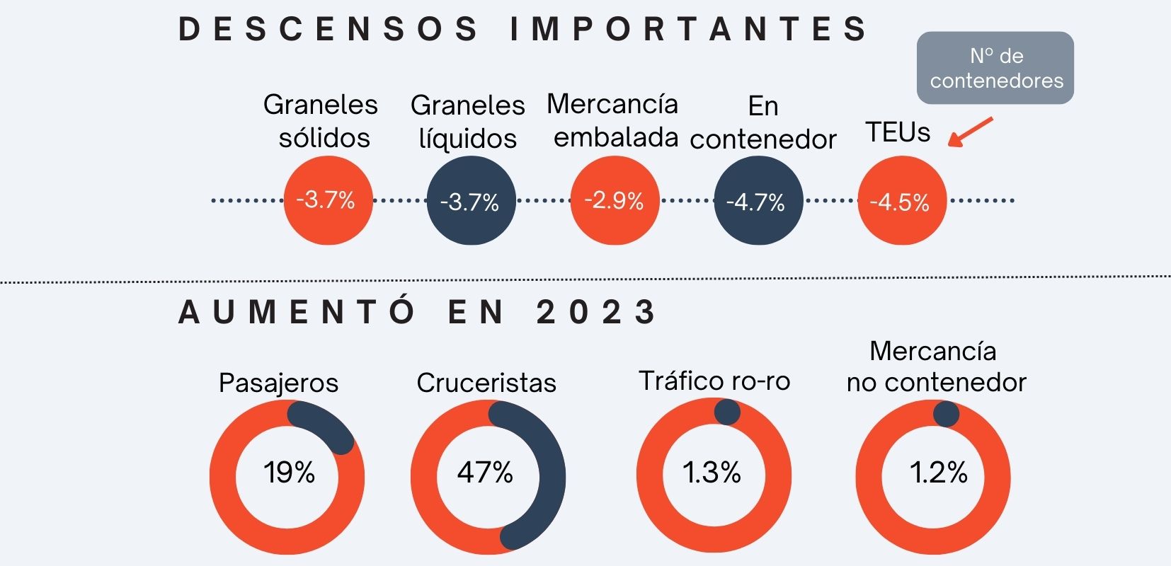 2023 ha sido un año marcado por un contexto de incertidumbre geopolítica y económica a nivel mundial, lo que ha impactado sobre los tráficos del sistema portuario de titularidad estatal. A la invasión de Ucrania se le ha sumado el conflicto en Israel y la franja de Gaza, cuyos efectos se han extendido sobre el Mar Rojo, una de las principales rutas comerciales del mundo. La economía global es muy sensible a este tipo de fenómenos con gran potencial de desestabilización territorial, y reaccionó con una fuerte inflación, empezando por el fuerte repunte de los precios de la energía, seguida de un desacoplamiento de numerosos procesos de producción y consumo. La cadena logística transoceánica se ha tensado hasta el punto de verse ralentizados o directamente interrumpidos ocasionalmente flujos de mercancías, lo que ha provocado caídas en los tráficos portuarios, especialmente los relativos a contenedores.
