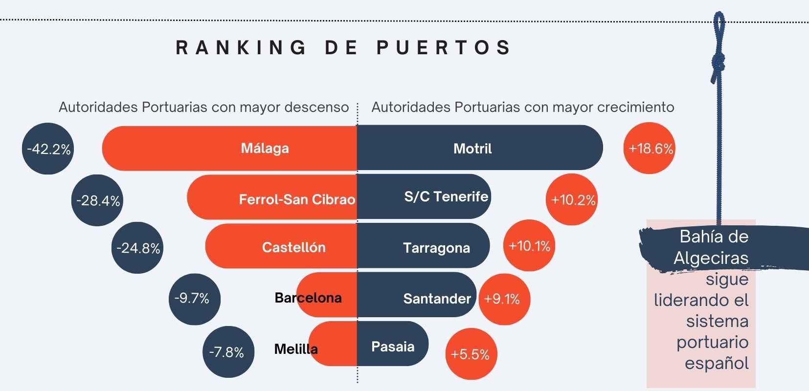 En general, el ranking en cuanto al total de mercancías movidas se ha mantenido igual que hace un año: Algeciras (104,7 millones de toneladas), a distancia de Valencia (77,2 millones) y Barcelona (64 millones), los tres con pérdidas respecto a 2022. Cartagena ha mantenido su cuarta posición con 37,5 millones de toneladas y de hecho ha incrementado sus tráficos el 2,7%, y también lo ha hecho Bilbao (0,1%), que se ha quedado con 32,9 millones de toneladas en la quinta posición.