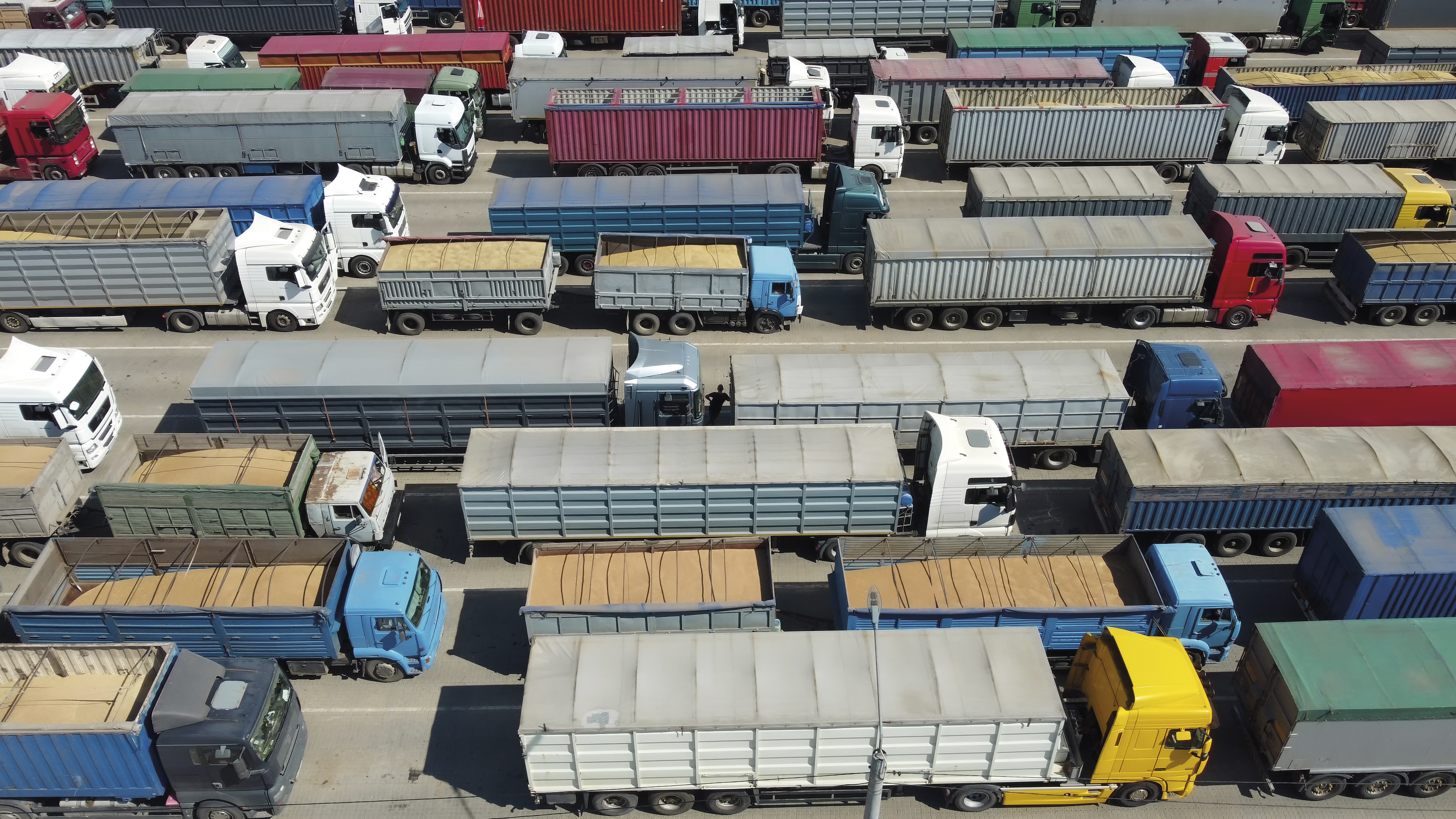 Camiones esperan para cargar graneleros en el puerto de Mariupol.