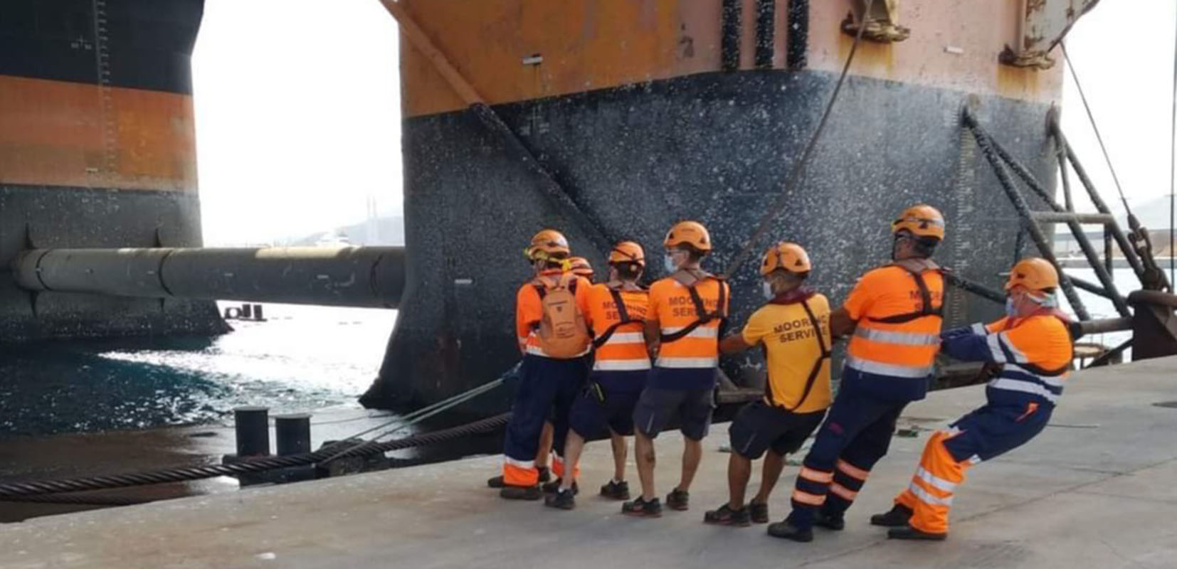 Tirando del cable de una plataforma petrolífera en la dársena de Escombreras. Foto: Amarradores del puerto de Cartagena