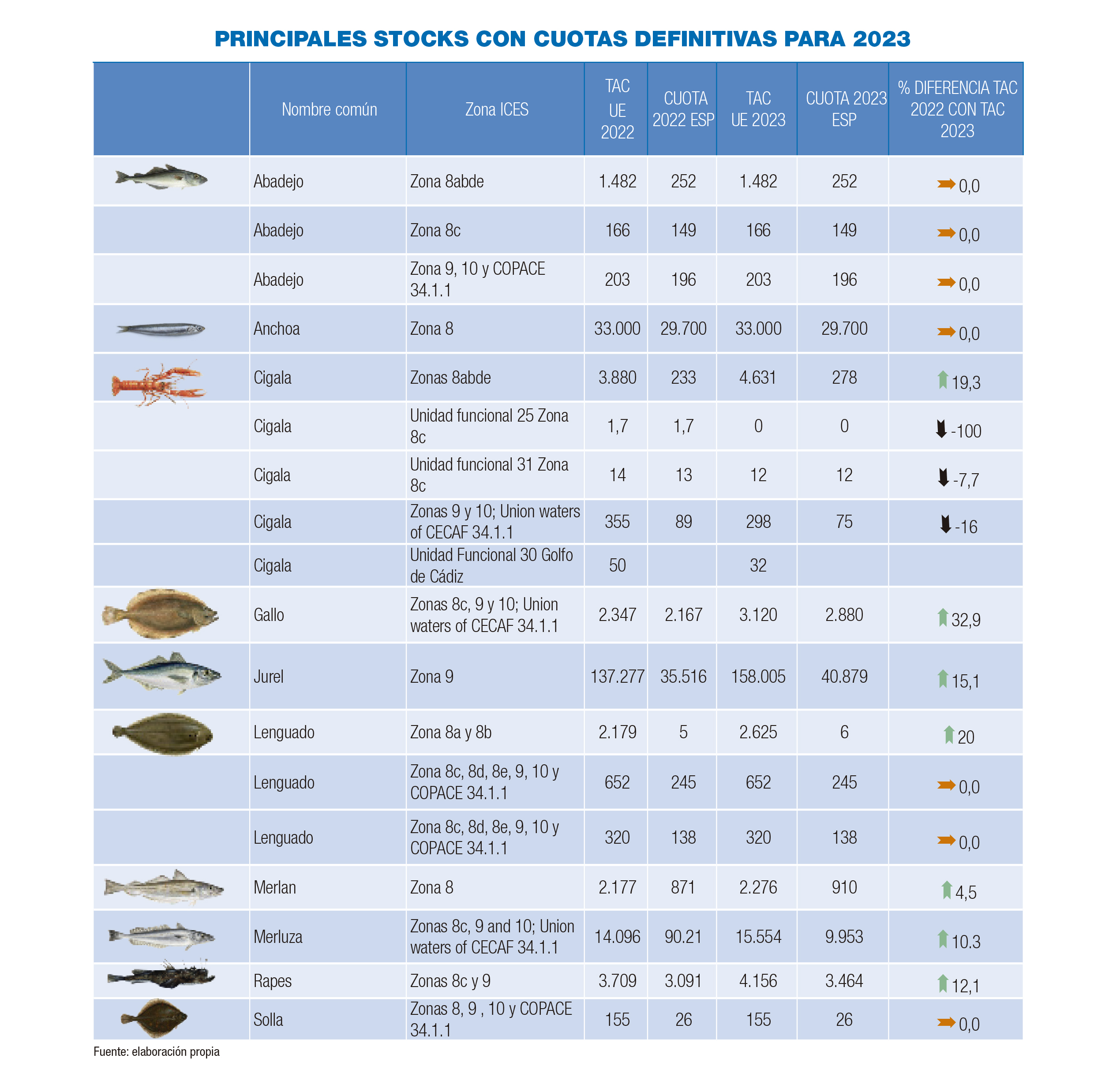 Aunque el jurel también se ha librado del TAC cero, no sale bien parada esta pesquería al indicar los cientificos que es un stock en malas condiciones. Por lo tanto, Europa solo permitirá una captura accesoria de 3.271T, lo que afectará especialmente a los barcos cerqueros que faenan en Gran Sol y Cantábrico. Teniendo en cuenta que en 2022 se han podido pescar 15.000T, los recortes son del 80%, sin embargo, el jurel en zona sur, Fisterra y Golfo de Cádiz mejora en un 15% respecto.