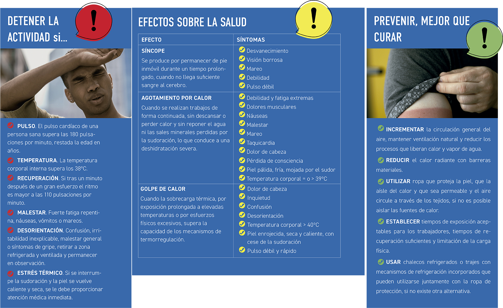 Los episodios de temperaturas anormalmente elevadas pueden tener importantes consecuencias sobre la salud (dermatitis, edemas, quemaduras, insolación, calambres o síncopes por calor). En algunos casos, efectos más graves como el agotamiento por calor o el golpe de calor que puede llegar a ser mortal o dejar importantes secuelas. Trabajar en estas circunstancias es una actividad de alto riesgo. ¿Qué se debe hacer en estos casos?