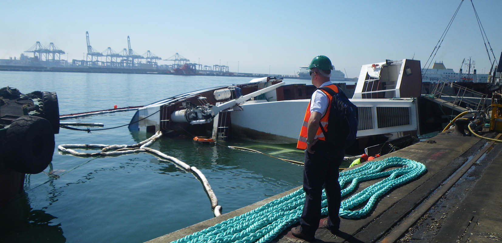 Investigador del CIAIM frente a un buque hundido en puerto PROCEDIMIENTO