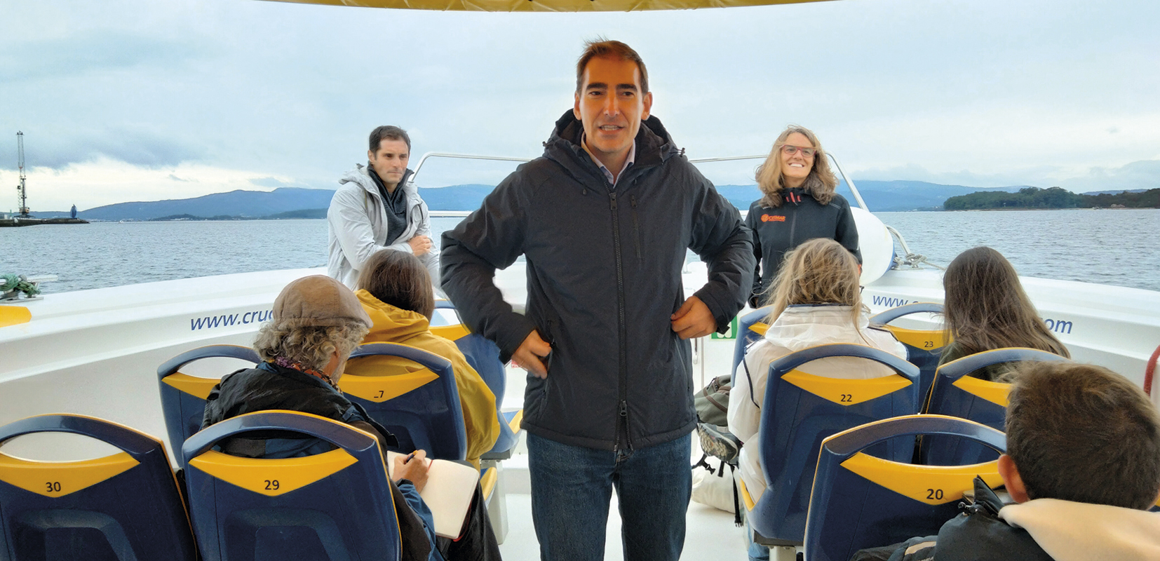Iniciamos la jornada en Vilagarcía de Arousa donde embarcamos para trasladarnos hasta una batea de investigación oceánica de la Xunta donde se recogen datos para distintos organismos científicos. Durante el trayecto, Javier Remiro, director de Economía y Empleo Azul de la Fundación Biodiversidad, explica que en esta zona del litoral “se llevan a cabo gran número de proyectos debido a los importantes centros de investigación existentes y al trabajo de las universidades gallegas, que están creando cantera y despertando vocaciones científicas”.
