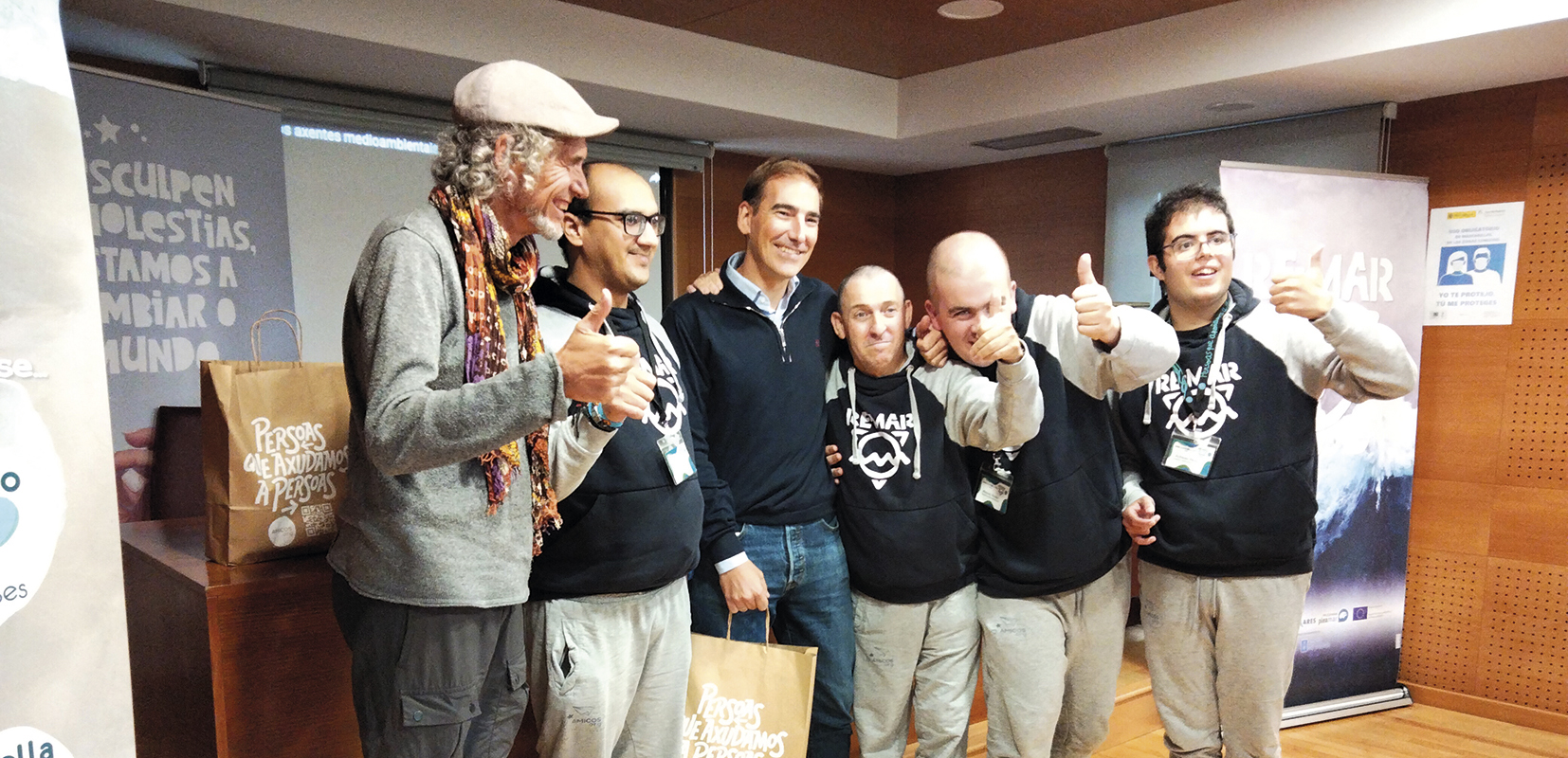 En Vilagarcía de Arousa, la organización Amicos.org nos presentó el proyecto Re-Mar que busca eliminar residuos, fomentando la participación ciudadana y concienciando de la necesidad de reducir la basura marina para conservar y proteger el patrimonio natural marino-terrestre de las rías bajas. Pero si ya es importante la labor de limpieza de costas y fondos que realiza, aún lo son mucho más sus voluntarios, quienes se han convertido en “guías ambientales”. Son, en la mayoría de los casos, personas con discapacidad intelectual superior al 70%, orgullosas del papel que desempeñan. “Fomentamos la inclusión social haciéndoles sentirse útiles a la sociedad”, dice Xoan España, director general de la organización.