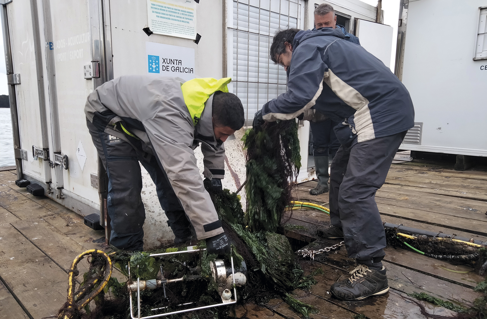 La batea de investigación a la que llegamos es una plataforma de madera situada cerca de la isla de Cortegada. Cuenta con generadores eléctricos y paneles solares. Bajo su esqueleto descansan, colgados en cuerdas, instrumentos de precisión que varios operarios sacan a la superficie. Las tareas de mantenimiento de los equipos consisten básicamente en limpiarlos de las algas y organismos que se adhieren a ellos.