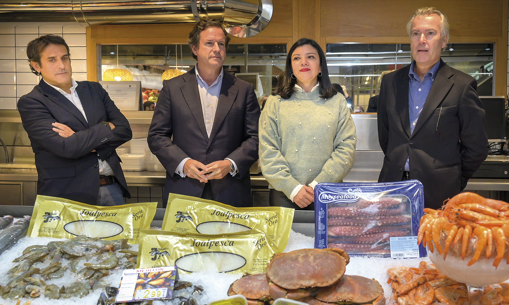 Javier Garat, presidente de Pesca España, junto con demás ponentes del evento en una pescadería promocionando la campaña