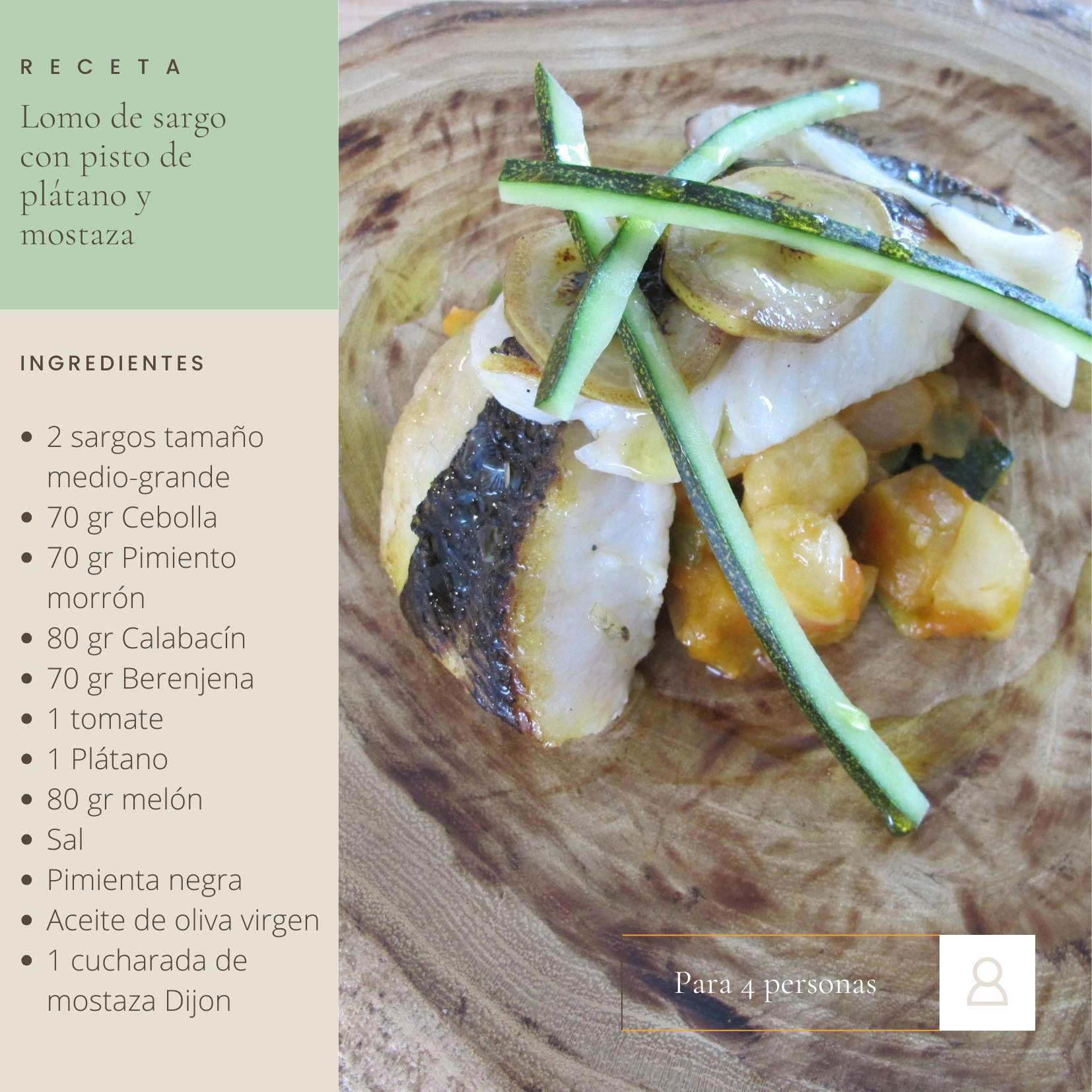 Montar el pisto caliente como base. Encima colocar los lomos de sargo recién salidos del horno. Decorar con tiras de piel de melón o algún crujiente de plátano. Rociar con fino chorro de aceite de oliva virgen.
