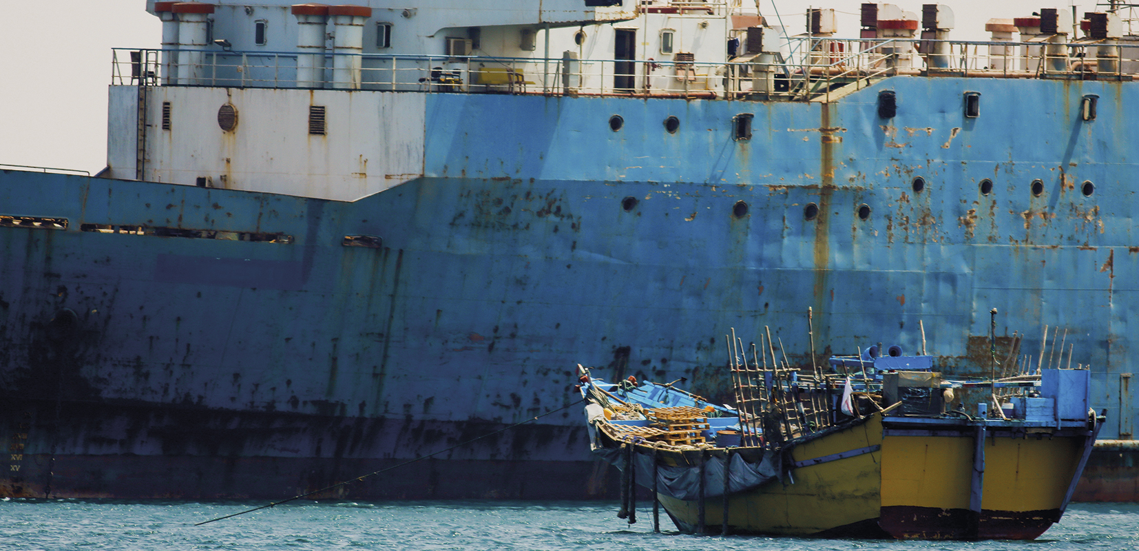 Buque hundido junto a un barco nodriza pirata en el puerto de Bosaso, Somalia
