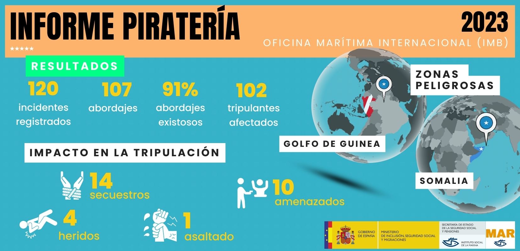 Según recoge el informe anual del IMB, se produjeron 120 incidentes de piratería marítima y robo a mano armada contra buques en 2023, frente a los 115 de 2022. Por tipo de incidentes, un total de 105 buques fueron abordados, cuatro buques fueron secuestrados, dos recibieron disparos por armas de fuego y se intentaron otros nueve ataques. El número de tripulantes tomados como rehenes pasó de 41 en 2022, a 73 en 2024, y los secuestrados de 2 a 14, respectivamente. Además, en 2023 otros 10 tripulantes fueron amenazados, cuatro heridos y uno asaltado.