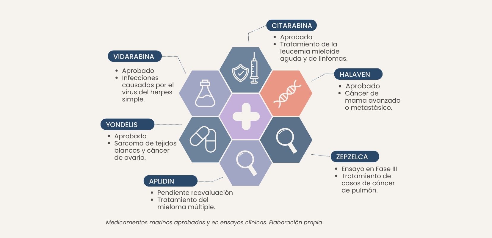 En 1977, la Administración de Alimentos y Medicamentos (FDA), aprobó la vidarabina como medio para tratar las infecciones provocadas por el virus del herpes simple. Hubo un momento en el que se produjo un parón en la búsqueda de nuevas moléculas, en casi 30 años no se aprobaron nuevos medicamentos, pero, en la actualidad, las medicinas que provienen directa, o, indirectamente del mar, viven una época de crecimiento y apogeo, ya que existen alrededor de 17 fármacos marinos que han llegado al mercado farmacéutico de la Unión Europea y de Estados Unidos y numerosos ensayos clínicos que se encuentran en fases I, II y III.