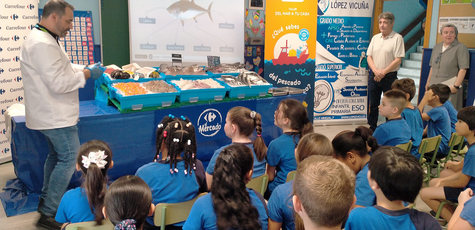 El colegio López Vicuña de Madrid convirtió en junio una de sus aulas en una pescadería donde 80 alumnos de 3º y 4º de Primaria participaron en el taller “Del Mar a tu Mesa”. A través de juegos, los escolares aprendieron a distinguir distintas especies y cómo se capturan. También descubrieron conceptos como la sostenibilidad y la trazabilidad en la cadena de producción y distintas recetas para consumir pescado fresco, congelado o en conserva.