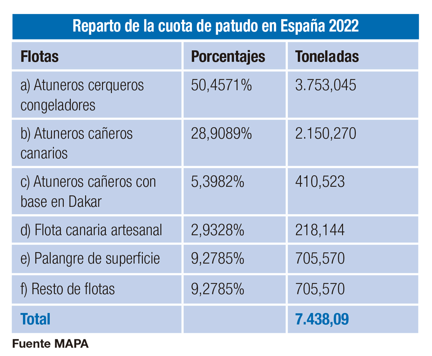 El 50% de la cuota total para España la reciben once cerqueros congeladores con capacidad para pescar ejemplares de más de 300 kg de la lista a) y que faenan en el Golfo de Guinea donde también se hacen con juveniles de menor peso, mientras que los pescadores artesanales con caña canarios se quedan con el 2,9 % de la cuota que además comparten con otros 18 atuneros, que muchos piensan que no deberían haber salido de la lista b).