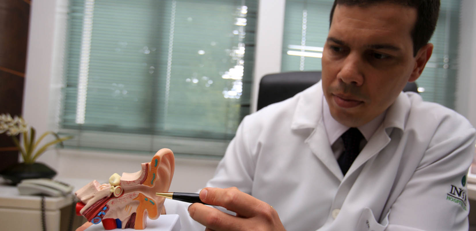 Médico otorrino mostrando una maqueta del oido por dentroTRATAMIENTO