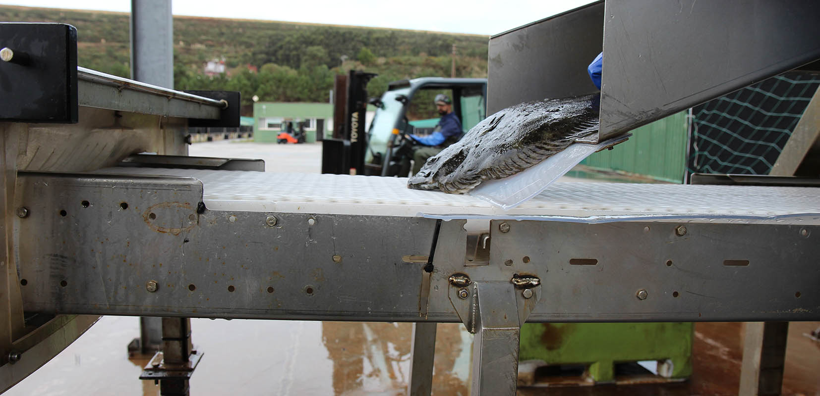 En la sala de procesado se envasan. El 99% de la producción se vende por piezas enteras y solo el 1% se eviscera. Los ejemplares se introducen en cajas con hielo y en menos de 12 horas están listos para su envío.